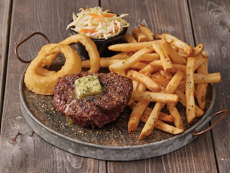Tender, juicy top sirloin - aged for 50 days, seasoned to perfection and fire-grilled to order. Served with two onion rings, your choice of in-house baked beans or coleslaw and seasoned fries. *Cannot guarantee steak doneness for take-out.