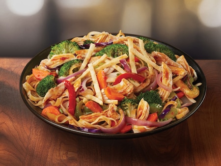 Our famous Stir Fry just got better! Rotisserie Chicken sautéed with broccoli, carrots, bell peppers, onions, red cabbage, and celery, all tossed in rice noodles and topped with crispy tortilla strips and green onion.