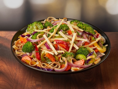 Our Famous Stir Fry just got better! Sautéed broccoli, carrots, bell peppers, onions, red cabbage and celery, all tossed in rice noodles and garnished with crispy tortilla and green onions.