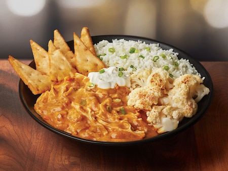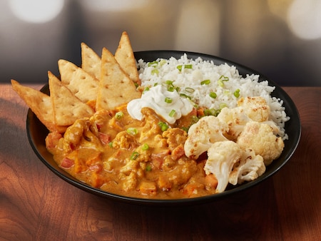Our famous rotisserie chicken in a delicious spicy vindaloo sauce sautéed with onions and tomatoes, served with rice and roasted cauliflower. Finished with a dollop of sour cream, green onions, and pita.