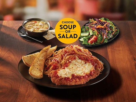 Great value! A juicy seasoned chicken breast hand-breaded in-house, and topped with tomato sauce and melted pizza mozzarella cheese. Served with pasta tossed in our classic tomato sauce, and garlic bread. Plus, your choice of a bowl of Chalet Chicken Noodle Soup or Starter Salad!