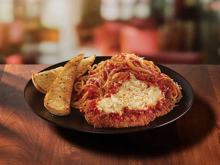 A juicy seasoned chicken breast hand-breaded in-house, topped with tomato sauce and melted pizza mozzarella cheese. Served with pasta tossed in our classic tomato sauce and a side of garlic bread.