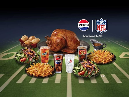 Get game day ready, with Pepsi® and the NFL®! Enjoy a whole Rotisserie Chicken served with your choice of 4 individual sides, 4 dinner rolls, 12oz Signature Chalet dipping sauce and 4 fountain pops. PLUS you will be entered for your chance to WIN* tickets to Super Bowl LXI in LA in 2027! The NFL Entities (as defined in the official rules) shall have no liability or responsibility for any claim arising in connection with participation in this promotion or any prize awarded (including any travel or travel-related activity thereto). The NFL Entities have not offered or sponsored this promotion in any way. NFL, the NFL Shield, and the word mark are registered trademarks of the National Football League. © NFL 2026. All Rights Reserved.
