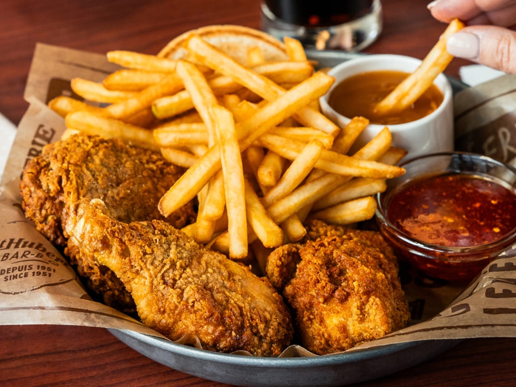 3 pieces of juicy, crispy fried chicken (drumstick, thigh and breast piece), served with a honey and piri-piri sauce. This meal includes: • 3 pieces of fried chicken • 1 honey and piri-piri sauce • 1 side of your choice • 1 bun • 1 serving of St-Hubert BBQ sauce • 1 serving of coleslaw For a limited time. Suggested serving.