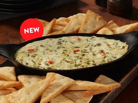 Perfect for sharing! A delicious creamy blend of four cheeses, spinach, and artichoke. Served warm with lots of pita for dipping.