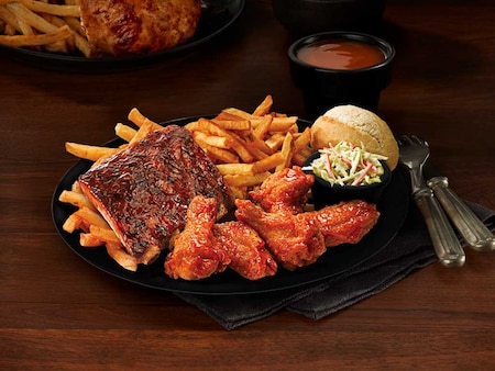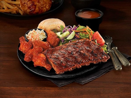 A Half Rack of BBQ Back Ribs and 5 wings tossed in your favourite sauce. Served with creamy coleslaw, a dinner roll, and your choice of side.