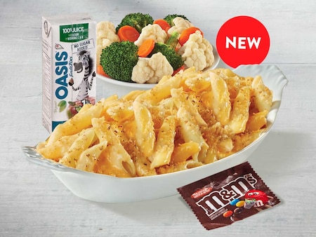 Our NEW! Mac & Cheese is cheesy, delicious, and baked to ooey gooey perfection. Served with your choice of side, an apple juice box, and Kid's treat.
