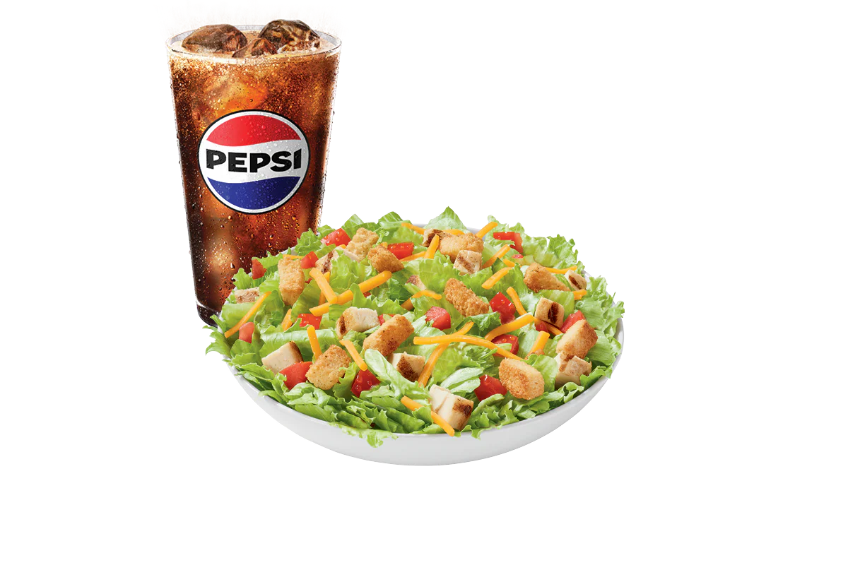 All white meat seasoned grilled chicken served on top of a crisp bed of lettuce, diced tomatoes, shredded cheddar and croutons. Served with your choice of dressing and a 21oz drink.