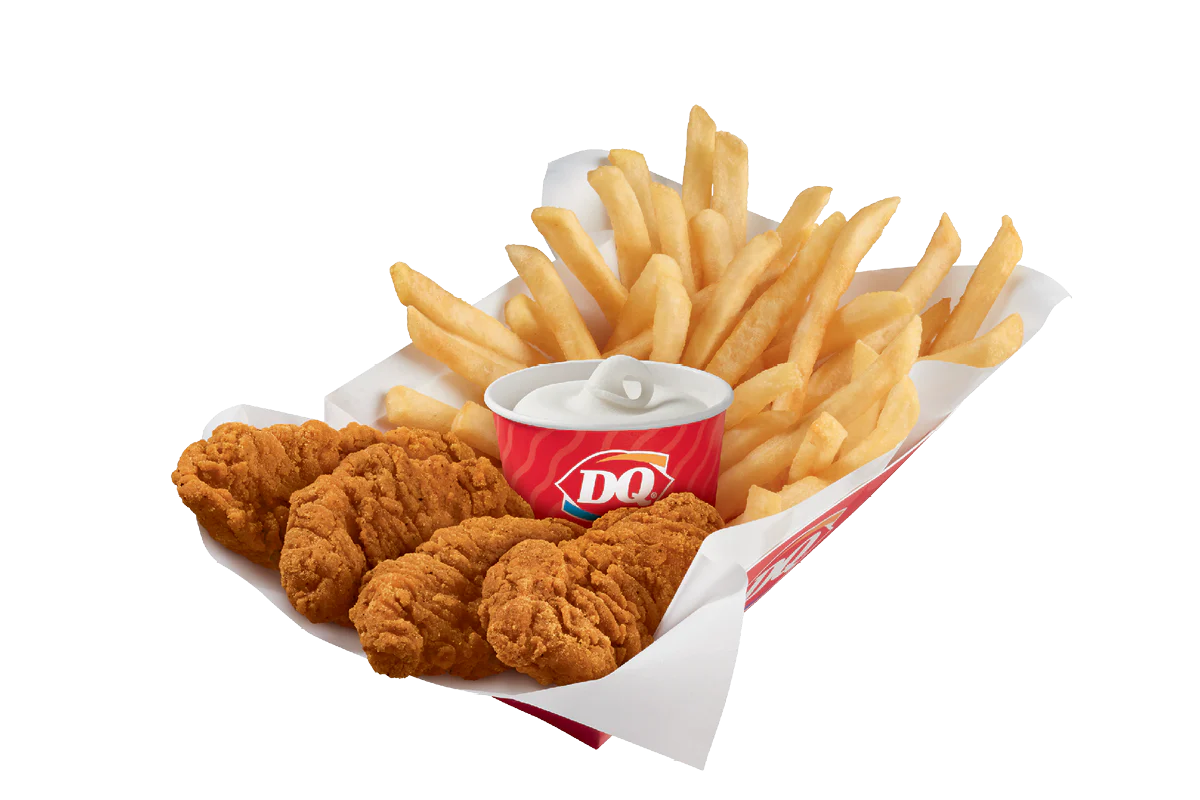 DQ® signature 100% white meat seasoned tenderloin chicken strips. Served with crispy fries, and your choice of dipping sauce, such as our delicious brown gravy. Available in a 4 or 6 piece basket.