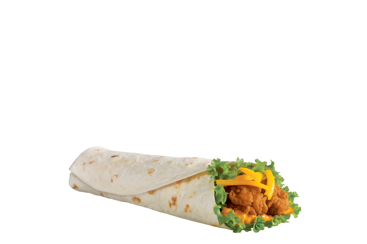 Crispy all white meat seasoned chicken strip with crisp lettuce, shredded cheddar cheese and creamy ranch dressing all wrapped in a flour tortilla.