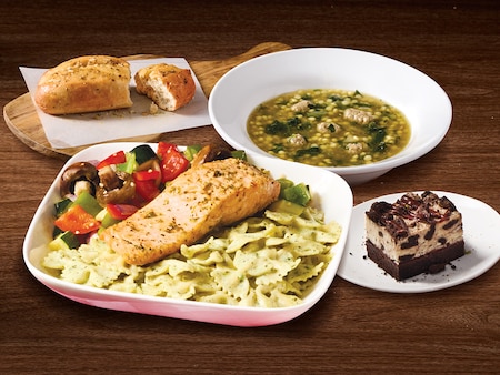 Perfectly seasoned salmon baked to perfection. Served with roasted Italian vegetables and creamy Alfredo pesto bow ties.