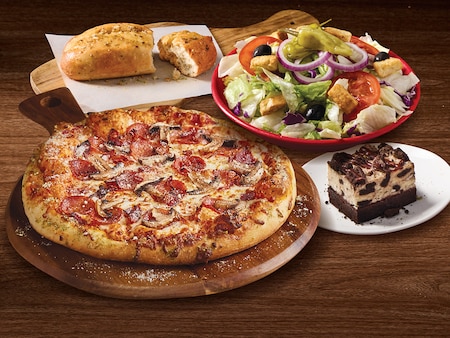 Comes with Mario's tomato sauce and pizza mozzarella. Then add two free toppings! Includes your choice of drink and dessert.