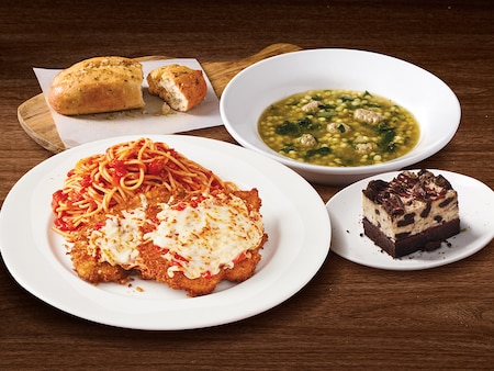 Hand-breaded Chicken Parmigiana made fresh daily. Served with loads of spaghetti and Mario's Signature Tomato Sauce. Finish your meal with a mini oreo cheesecake.