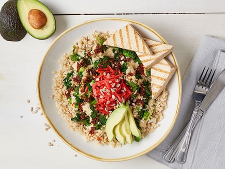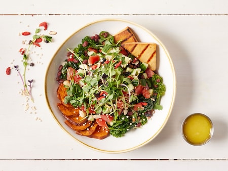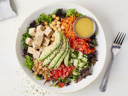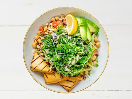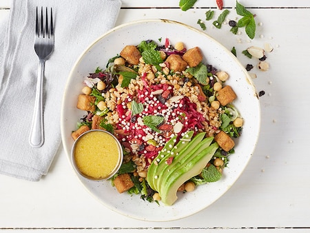 Marinated farro, quinoa+lentil blend, mint, parsley, avocado, Seeds+, beet sauerkraut, chickpeas, crispy tofu cubes, power greens, heritage blend lettuce, fresh salad topper (contains nuts), choice of dressing