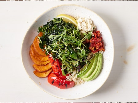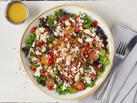 Marinated farro, heritage blend lettuce, Seeds+, vegan feta, chickpeas, tomato, red onion, cucumber, red pepper, bold lemon dressing