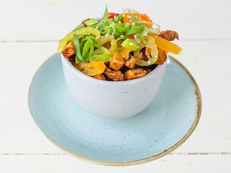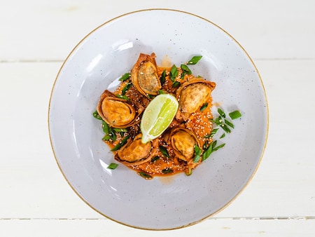 Spinach, shiitake & pine nut dumplings, taberu rayu mayo, green onion, chili oil, sesame seeds, lime. Gluten allergies cannot be accommodated on this menu item.