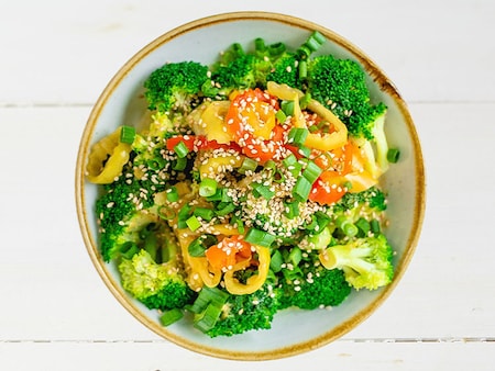 Steamed broccoli, miso gravy, hot banana chilies, scallions, sesame seeds, chili oil. Gluten allergy friendly.