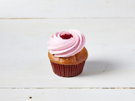 Lemon cupcake filled with vanilla mascarpone, topped with blackberry whip and compote