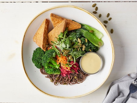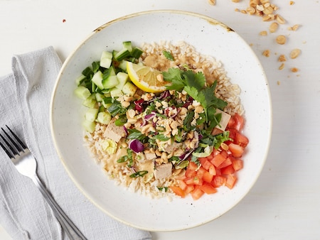 Peanut sauce, marinated tofu cubes, tomato, cilantro, cucumber, power greens, green onions, roasted peanuts, sumac, lemon. Gluten allergy? Order your bowl with rice instead of soba.