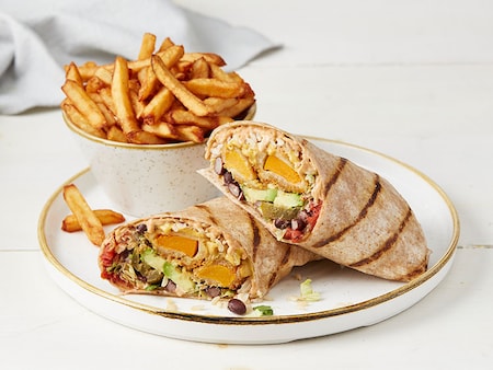 Marinated black beans, crispy panko squash, cashew queso, jalapeño aioli, avocado, salsa, brown rice, chipotle mayo, pickled jalapeños, shredded lettuce, grilled whole-wheat tortilla. Gluten allergies cannot be accommodated on this menu item.
