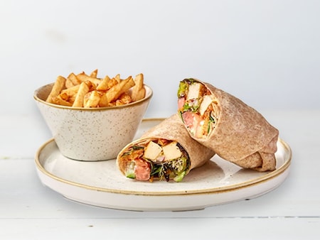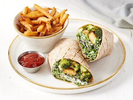 Roasted broccoli, heritage blend lettuce, chick'n tenders, caesar dressing, grilled whole wheat tortilla with choice of side. Gluten allergies cannot be accommodated on this menu item.
