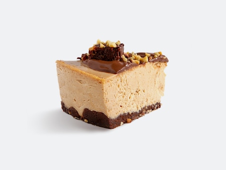 Smooth and creamy, this Peanut Butter Cheesecake tastes as luscious as it looks. Starting with a rich, gluten-free brownie base, layered with smooth cheesecake filling, and finally, topped with peanut butter brownie chunks and a drizzle of chocolate.