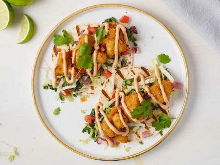 Crispy cauliflower, lettuce, power greens, chipotle mayo, tomato, onion, lime, cilantro (2 per order). Gluten allergies cannot be accommodated on this menu item.