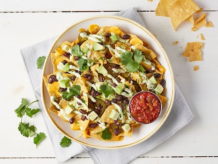 Cashew queso, avocado, jalapeño aioli, marinated black beans, tomato salsa, pickled jalapenos, shredded lettuce, cilantro, corn tortilla chips. Gluten allergy friendly.