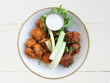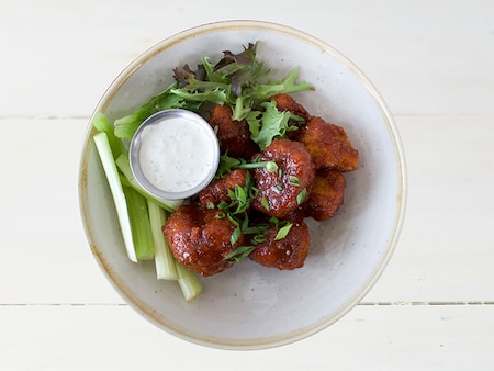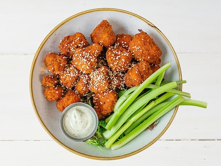 Crispy cauliflower, buffalo sauce, hemp hearts. Gluten allergies cannot be accommodated on this menu item.