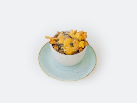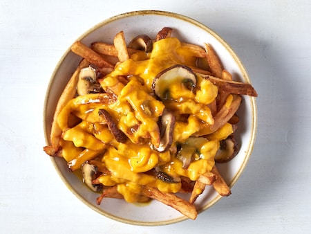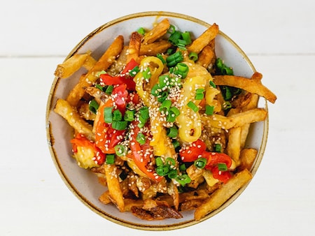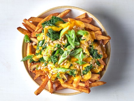fries, vegan cheese sauce, mushroom gravy, steamed greens, scallions, sunflower seeds