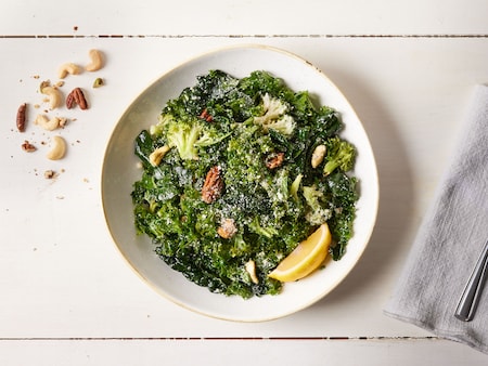 Massaged kale, roasted broccoli, toasted nuts, vegan parmesan, caesar dressing, lemon. Gluten allergy friendly.