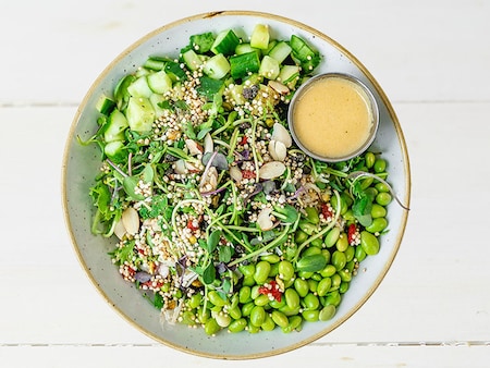Edamame, napa cabbage, cucumber, micro greens, parsley, cilantro, fresh salad topper (contains nuts), heritage blend lettuce, choice of dressing. Gluten allergy friendly.