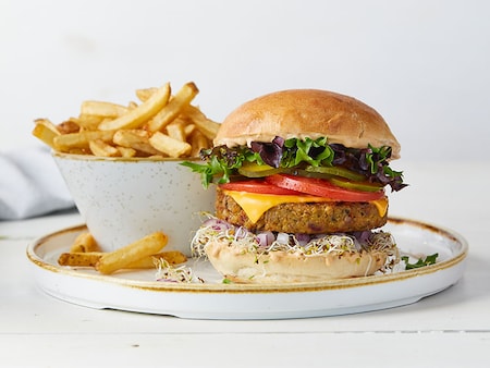 Special sauce, vegan cheddar cheese, pickles, red onion, tomato, alfalfa, heritage blend lettuce, toasted bun, house-made grain burger. Gluten allergy? Upgrade to a Beyond Patty without a bun for a gluten-friendly alternative.