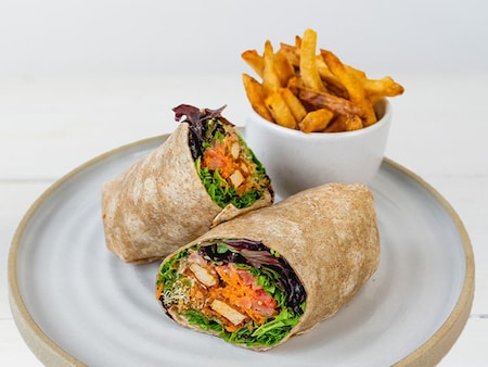 Tempeh bacon, crispy tofu steaks, tomato, carrot, red onion, alfalfa sprouts, pickles, garlic mayo, heritage blend lettuce, grilled whole-wheat tortilla. Gluten allergy? Opt for a bed of lettuce instead of the wrap.