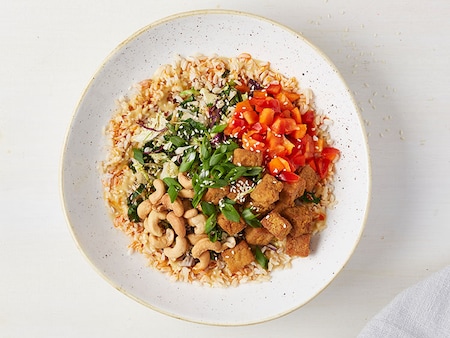 Grilled napa cabbage & power greens, crispy tofu cubes, chili oil, red pepper, cashews, sesame seeds, scallions, 369 dressing. Gluten allergy? Order your bowl with rice instead of soba.