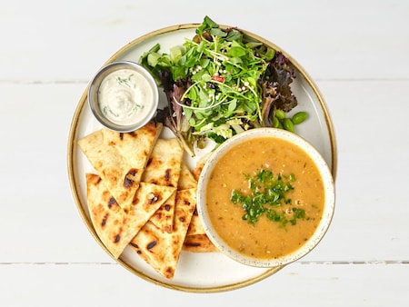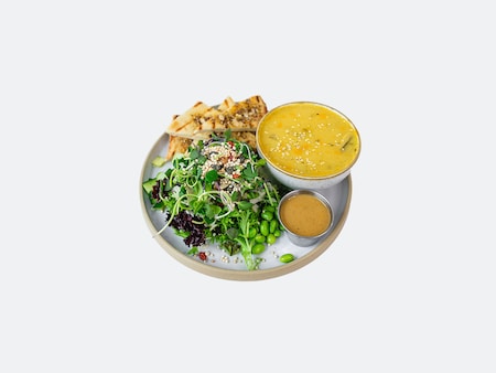 A bowl of daily soup, side Eat Your Greens salad (contains nuts), grilled pita, choice of dressing.