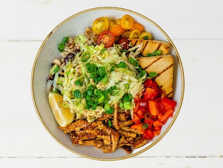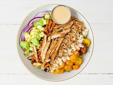 Tempeh bacon, crispy chick'n, avocado, marinated farro, vegan feta, tomato, red onion, mixed and shredded lettuce, choice of dressing.