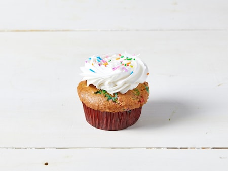 Vanilla sprinkle cupcake filled with mascarpone, topped with vanilla icing and sprinkles