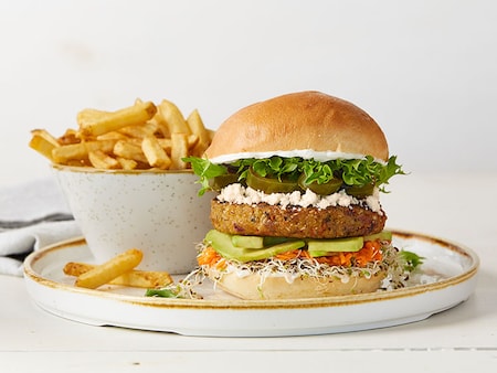 Avocado, vegan feta, garlic mayo, pickled jalapeños, alfalfa, carrot, heritage blend lettuce, toasted bun, house-made grain burger. Gluten allergy? Upgrade to a Beyond Patty without a bun for a gluten-friendly alternative.