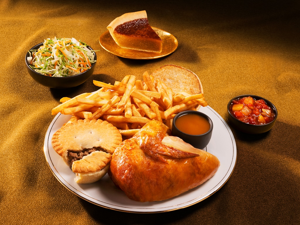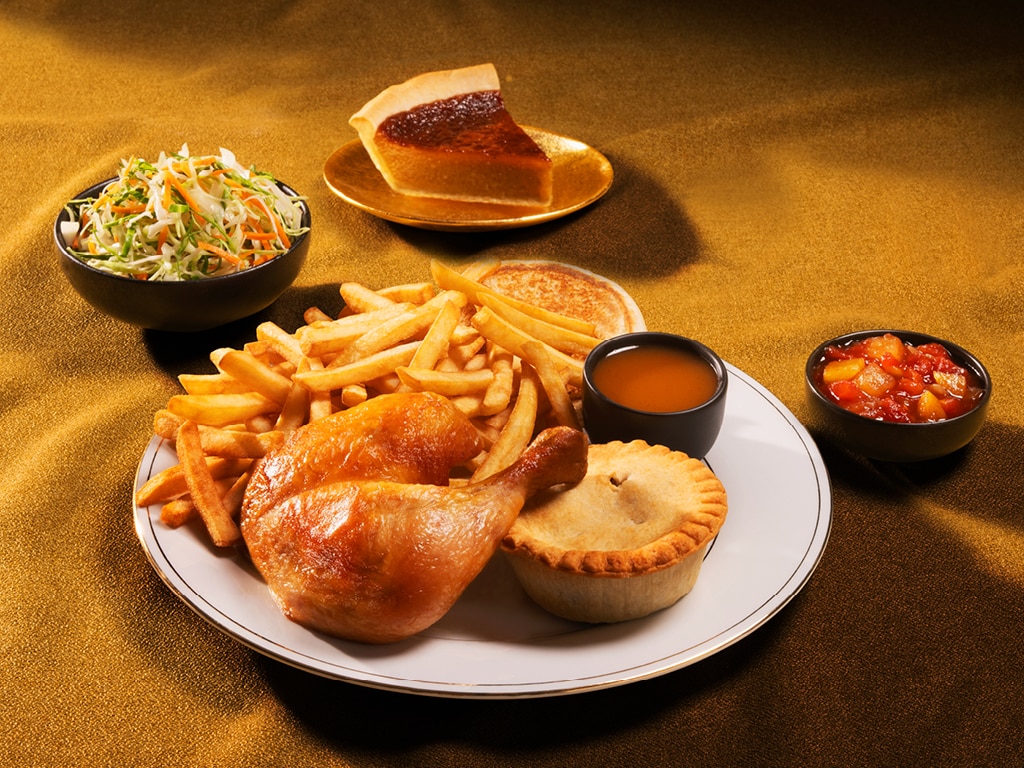 A real holiday feast including our generous mini meat pie and our decadent sugar pie. This meal includes: • 1 rotisserie chicken leg • 1 side of your choice • 1 mini meat pie with fruit ketchup • 1 bun • 1 serving of St-Hubert BBQ sauce • 1 serving of coleslaw • 1 slice of sugar pie Suggested serving.For a limited time.
