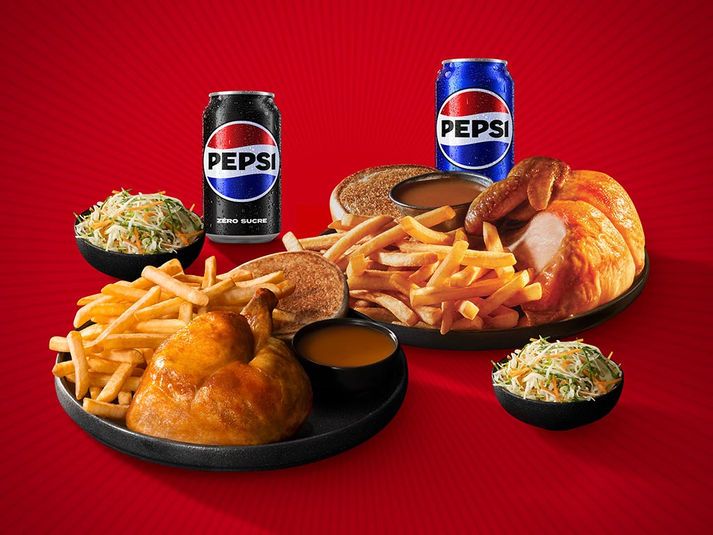Rotisserie chicken meals for 2 to 9 people. Each meal is served in an individual meal box, and includes: • 1 chicken leg or breast • 1 side of your choice • 1 serving of St-Hubert BBQ sauce • 1 bun • 1 serving of coleslaw For a limited time, add a 355 mL soft drink can for $0.95 per meal. Minimum of 2 quarter-chicken meals (half leg and half breast) for the Hoiday Economix meal. For an odd number of meals, the quarter leg takes priority. The price includes a single meal. Suggested serving.