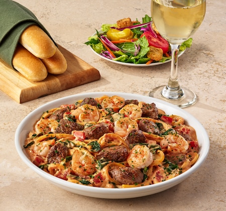 Grilled sirloin tips, shrimp, and bucatini pasta tossed in a spicy calabrian cream sauce with spinach and tomatoes. Steak prepared medium.