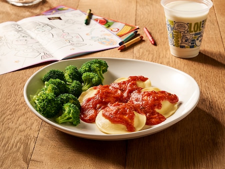 Kid-sized Italian cheese-filled ravioli with tomato sauce.<br><br>Includes 1% low fat milk and side for children under 12.<br><br>Does not include soup or salad.