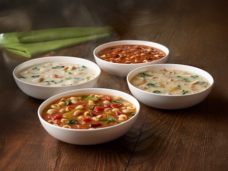 Choice of homemade soups:<br><b> - Chicken & Gnocchi - </b>A creamy soup made with roasted chicken, traditional Italian dumplings and spinach.<br><b> - Pasta e Fagioli - </b>White and red beans, ground beef, fresh tomatoes and tubetti pasta in a savory broth.<br><b> - Minestrone (V) - </b>Fresh vegetables, beans and pasta in a light tomato broth - a vegan classic.<br><b> - Zuppa Toscana - </b>Spicy Italian sausage, fresh kale and russet potatoes in a creamy broth.