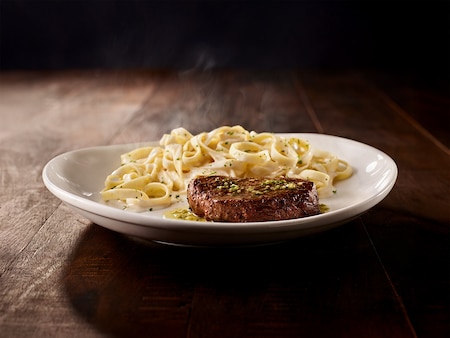 Grilled 6 oz sirloin topped with garlic herb butter. Served with a side of fettuccine alfredo.