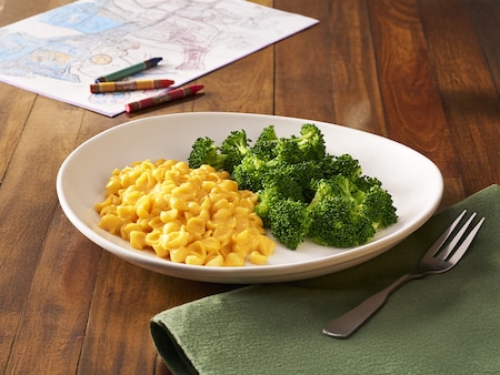 Kid-sized pasta shells in a creamy cheese sauce.<br><br>Includes 1% low fat milk and side for children under 12.<br><br>Does not include soup or salad.