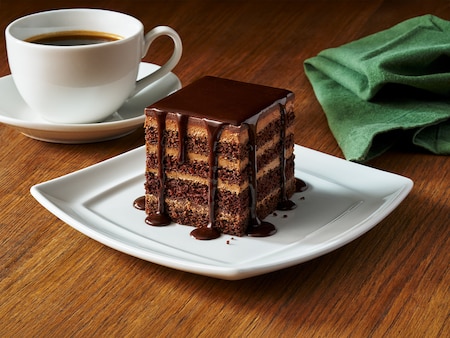 Decadent layers of chocolate cake, creamy chocolate mousse, and a delicate layer of crushed wafers. Topped with chocolate sauce.