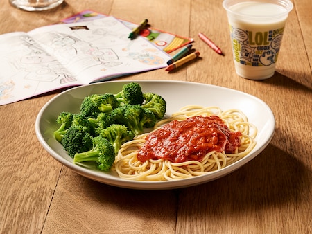 Kid's gluten-free rotini pasta with meat sauce.** Served with a side of grapes or broccoli.Includes 1% low fat milk for children under 12.<br><br>**Our meat sauce is made with pan-seared beef and Italian sausage.<br><br>Does not include soup or salad.<br><br>Breadsticks not included to accommodate dietary needs. Available upon request.