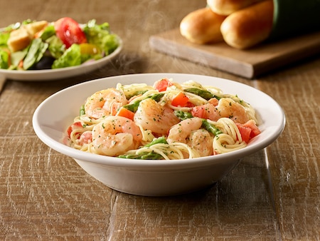 Shrimp sautéed in a garlic sauce, tossed with asparagus, tomatoes, and angel hair pasta.<br><br>Available weekdays, 11am-3pm.