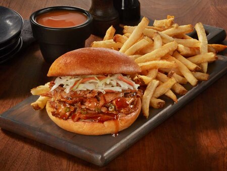 Pulled BBQ Back Rib meat tossed in your choice of Smoky BBQ, or Honey Garlic sauce. Topped with creamy coleslaw on a toasted bun, and served with your choice of side.